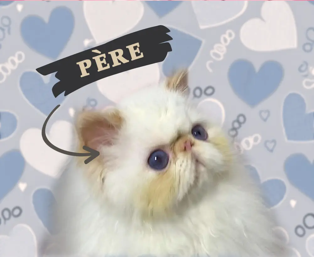 C’est le fils de Trésor of Royal Fragrance, et de Ombretta blue eye Latin lover. Ses lignées sont exceptionnelles pour un CPC (persan uni porteur du gêne colourpoint): Maradan et Genhemie’s, Arcobaleno et Yellicle d’un côté, et Blue velvet sky, Benoma et Sandypaws de l’autre.